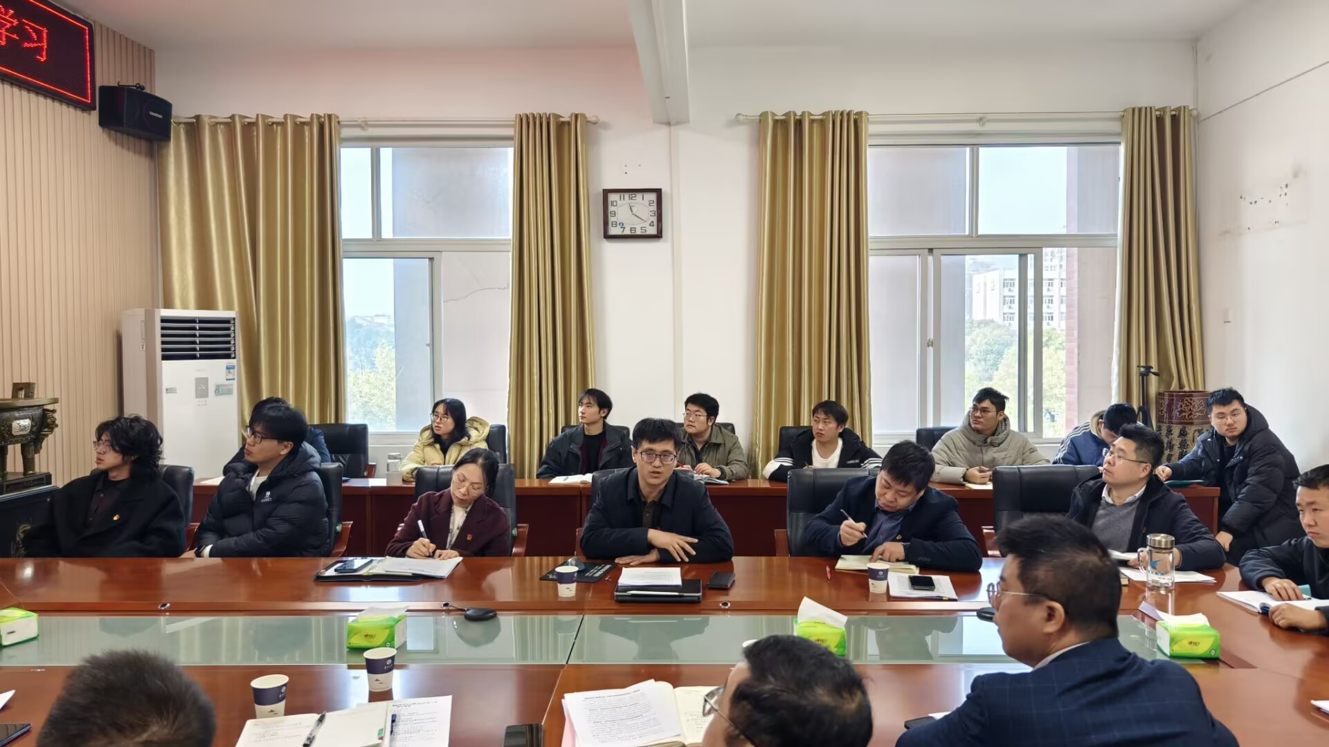 随后,会议集中学习了近期重要会议和文件精神。副院长谷惠文领学习近平总书记在中央经济工作会议上的重要讲话精神;院长赖璐领学《学习好贯彻好党的二十届四中全会精神》重要文章;党委副书记杨会军传达中共中央政治局关于党风廉政建设和反腐败工作的最新部署;院长助理黄河领学2026年湖北省科技创新大会精神。