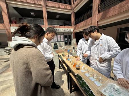 展位以科普展板、互动实验和知识答题为载体,吸引了大量师生驻足参观。展板围绕淡水资源现状、污水净化原理、水质检测方法等内容展开,将复杂的环保知识转化为通俗易懂的科普内容;志愿者现场演示污水净化实验,通过活性炭吸附、胶体沉淀等流程,让观众直观感受化学工艺在水资源保护中的应用;并结合20道知识答题传播环保知识,引导师生主动参与护江行动。