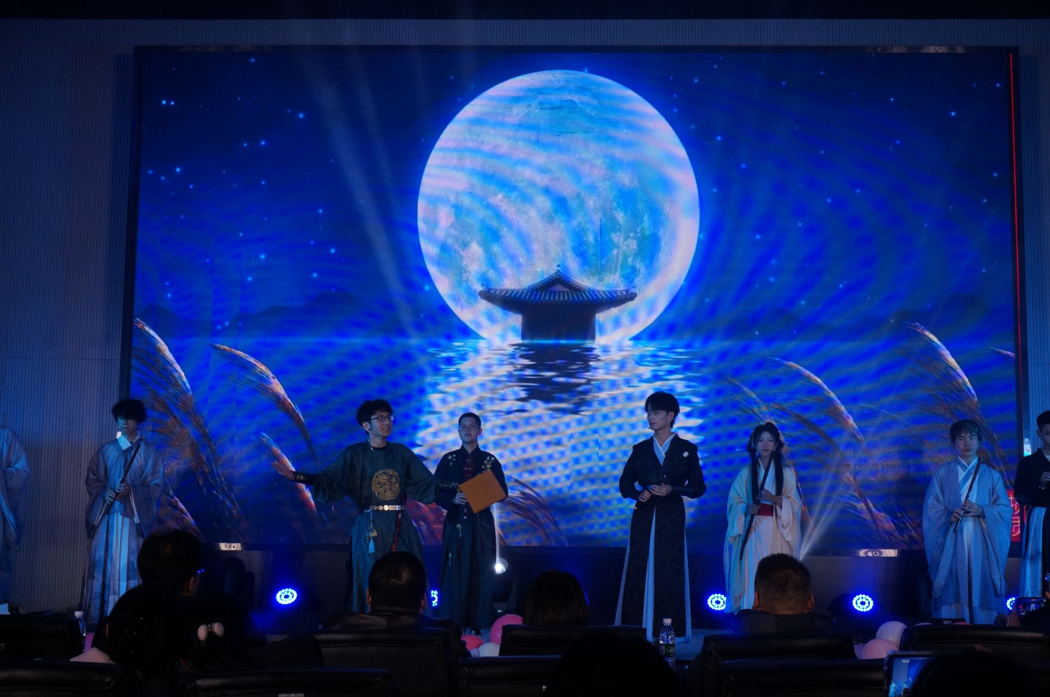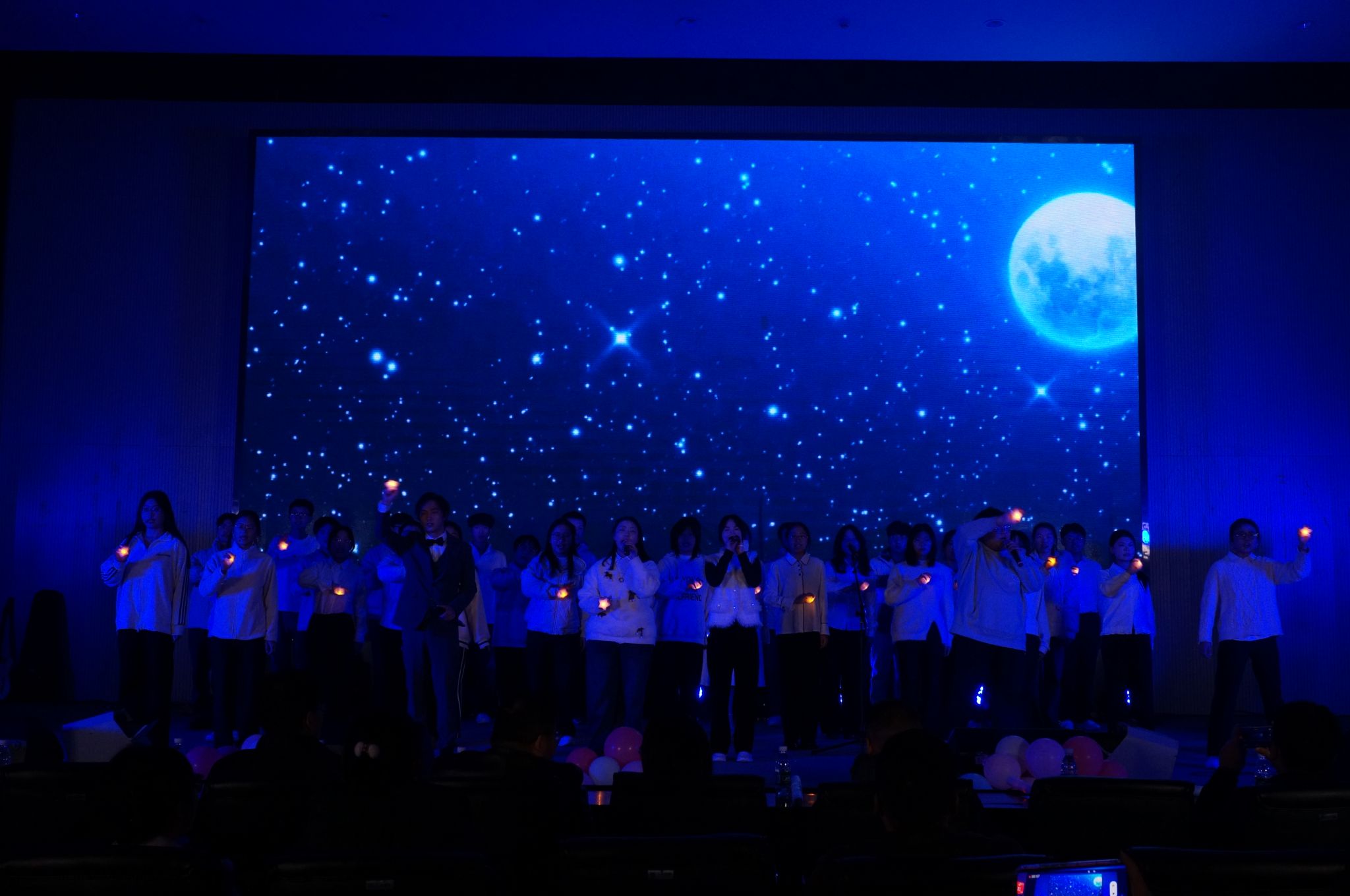 由学生会带来的朗诵《觉醒》铿锵有力、饱含深情,字里行间洋溢着青年学子的责任与担当;程紫菱、艾秦薇等同学演绎的舞蹈《寄明月》舞姿曼妙,古典韵味悠长,将观众带入诗意画卷。王珅珅、闵丽君合唱的《美丽的神话》深情款款,婉转的歌声诉说着动人故事。青支队、化昱班第二期全体成员带来的《夜空中最亮的星》,全体成员携手合唱,传递出同心筑梦、共赴新程的坚定信念,现场观众纷纷挥动荧光棒,晚会在温馨而热烈的氛围中落下帷幕。
